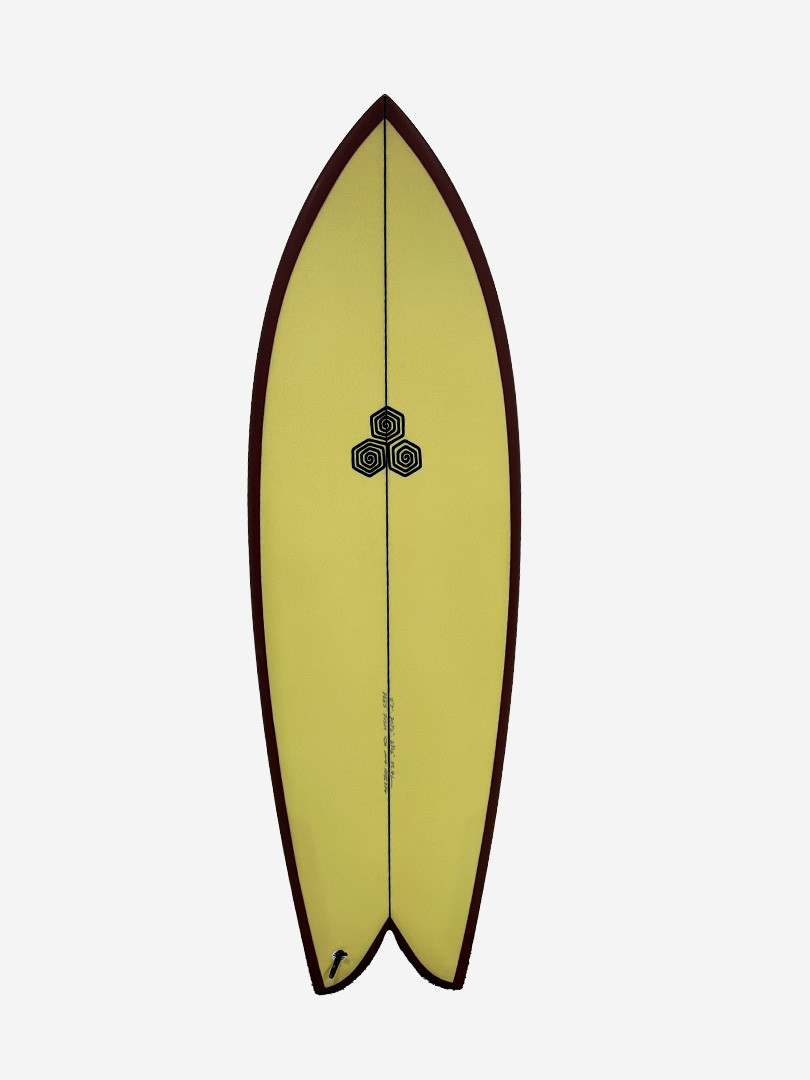 For sizing reference on the Feb's Fish, Mikey is 6'3, 75kgs and rides the 5'5 in stock dims.